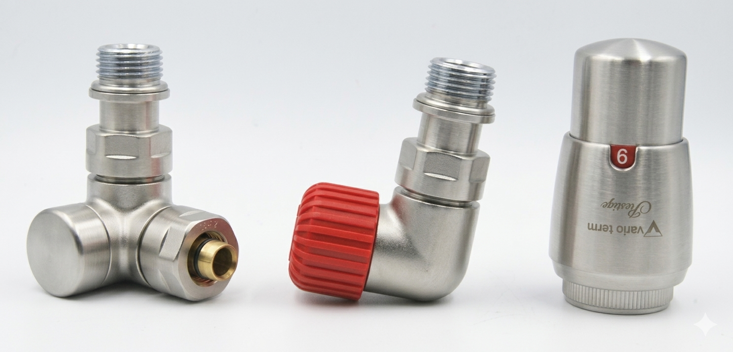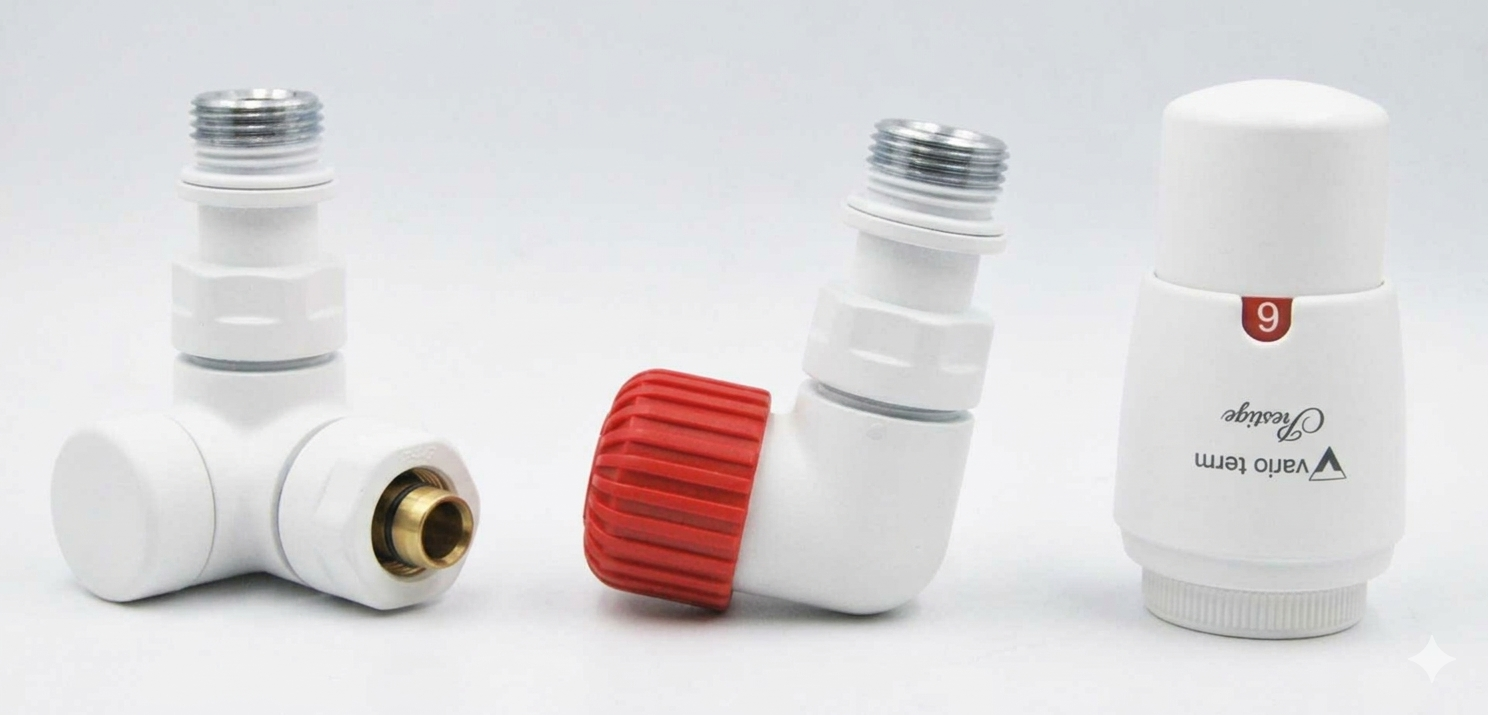 Комплект состоит из осевого термостатического клапана, углового запорного и термостатической головки Prestige.